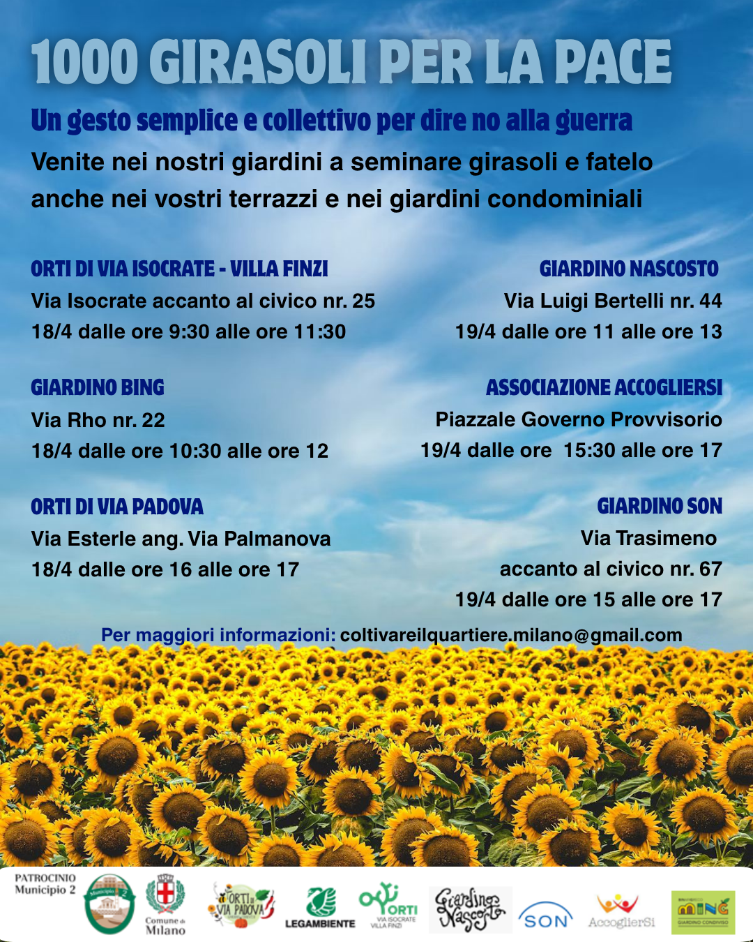 Invitiamo cittadine e cittadini a partecipare alla semina condivisa di girasoli nei giardini del quartiere e a replicare l’iniziativa anche sui propri terrazzi, balconi e negli spazi condominiali. Un piccolo gesto simbolico che diventa più forte quando compiuto insieme, come segno di speranza e di comunità.