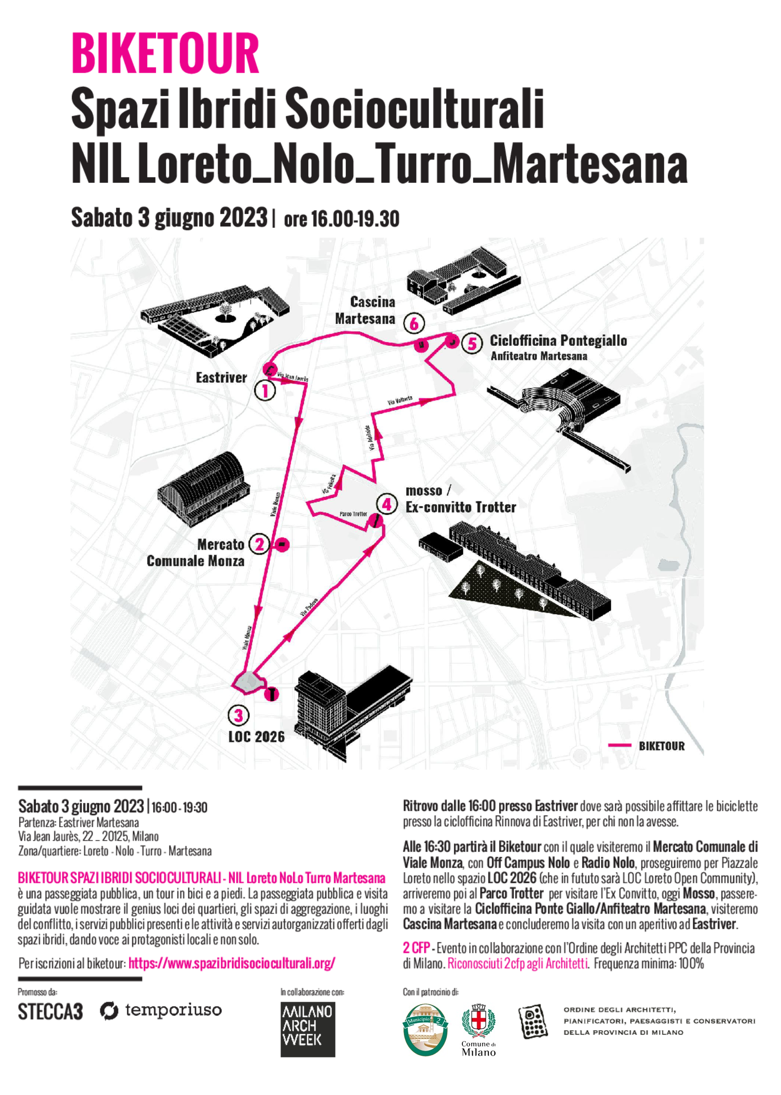 Il ritrovo è alle 16:00, con possibilità di affittare le biciclette presso la ciclofficina Rinnova di Eastriver, e il tour passerà dal Mercato Comunale di viale Monza, con Off Campus Nolo e Radio Nolo, per proseguire per piazzale Loreto nello spazio LOC 2026 (che in fututo sarà LOC Loreto Open Community); si arriverà al parco Trotter per visitare l’Ex Convitto, oggi Mosso, per poi passare alla Ciclofficina Ponte Giallo/Anfiteatro Martesana, Cascina Martesana e ritornare ad Eastriver, per l'aperivito finale.