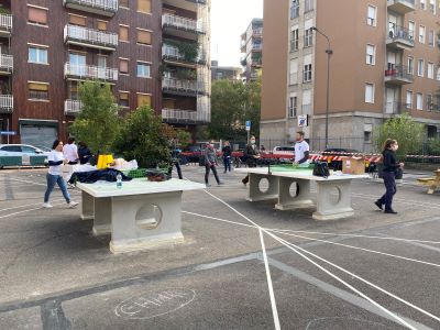 Lo spazio è stato arredato con tavoli da ping-pong e da pic-nic, panchine, rastrelliere per biciclette e alberi in vaso. Il manto stradale, come da tradizione Piazze Aperte, è stato colorato in chiave di urbanistica tattica dai tanti volontari coinvolti.